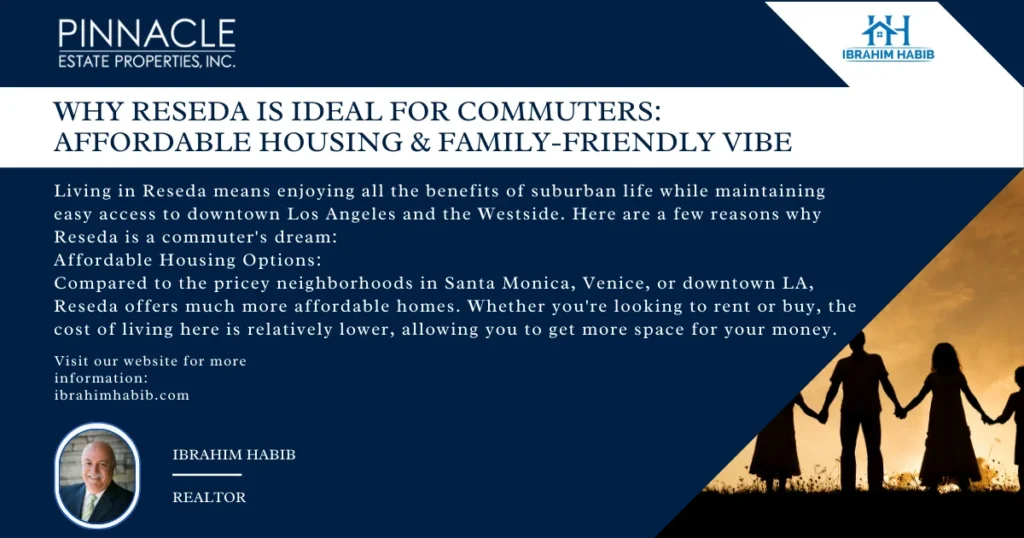 Living in Reseda means enjoying all the benefits of suburban life while maintaining easy access to downtown Los Angeles and the b7923a. Here are a few reasons why Reseda is a commuter’s dream: Affordable Housing Options: Compared to the pricey neighborhoods in Santa Monica, Venice, or downtown LA, Reseda offers much more affordable homes. Whether you’re looking to rent or buy, the cost of living here is relatively lower, allowing you to get more space for your money. Family-Friendly Atmosphere: Reseda is well-known for its family-friendly vibe, featuring great schools, numerous parks, and a safe environment. It’s perfect for those who want a peaceful home base to return to after a busy day of commuting. Community-Oriented Living: With its vibrant, multicultural community, Reseda offers a mix of dining, shopping, and local events that make it a welcoming and lively place to live. 5- Things to Do in Reseda When You’re Not Commuting When you’re not commuting, there’s plenty to explore in Reseda! Here are a few local spots to check out during your downtime: Reseda Park: Reseda Farmers Market: The Great Wall of Reseda: Conclusion: Reseda is the perfect neighborhood for commuters looking to enjoy suburban peace while staying connected to all the action in Los Angeles. With easy access to major freeways, public transportation, affordable housing, and plenty of local amenities, Reseda offers an ideal living situation for those who need to travel for work but also want to come home to a quiet, family-friendly environment. Ready to explore real estate opportunities in Reseda? Contact Ibrahim Habib today to find your dream home in this well-connected and vibrant community.
