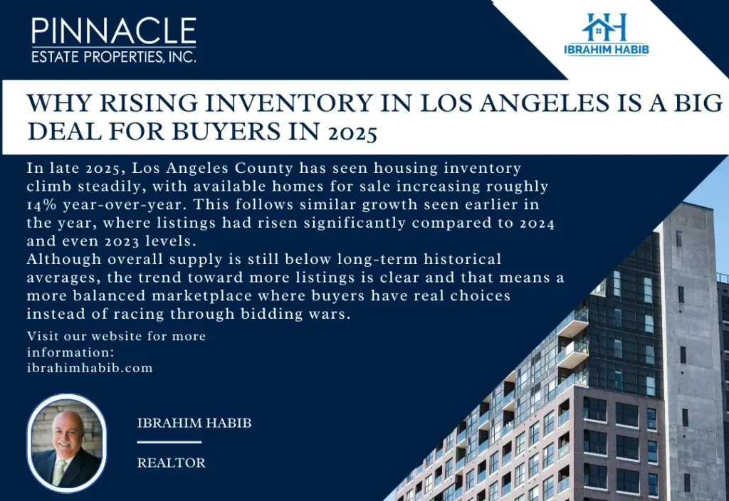 For much of the last decade, Los Angeles has been known for low housing inventory, steep competition, and rapid price growth. But in 2025, that trend is shifting and buyers are beginning to feel the difference. First Tuesday Journal+1 Inventory Is Growing But Still Below Historic Norms In late 2025, Los Angeles County has seen housing inventory climb steadily, with available homes for sale increasing roughly 14% year-over-year. This follows similar growth seen earlier in the year, where listings had risen significantly compared to 2024 and even 2023 levels. First Tuesday Journal Although overall supply is still below long-term historical averages, the trend toward more listings is clear and that means a more balanced marketplace where buyers have real choices instead of racing through bidding wars. Justin Borges Homes Are Taking Longer to Sell Another key change: homes are staying on the market longer. Buyers now often have weeks not days to decide and negotiate, which wasn’t the case during the ultra-heated markets of 2021–2023. This gives buyers more time to shop around, compare neighborhoods, and negotiate on price or terms. Amalfi Estates What Buyers Can Do Now With inventory rising, buyers have greater leverage: A Balanced Market Not a Crash Despite more listings, prices in Los Angeles have remained relatively stable, without dramatic declines reflecting strong demand and ongoing affordability challenges. But the market is no longer purely in sellers’ favor. Moderate price growth and rising inventory point toward more equitable conditions for both buyers and sellers. Skybridge Property Bottom line: While Los Angeles hasn’t flipped into a full buyer’s market yet, 2025 marks one of the first periods in years where buyers have genuine choices, time, and negotiation power. For anyone looking to enter the LA market, this shift could present meaningful opportunities.