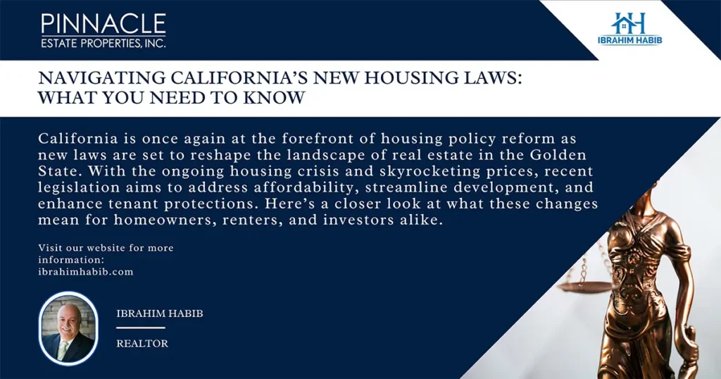 California is once again at the forefront of housing policy reform as new laws are set to reshape the landscape of real estate in the Golden State. With the ongoing housing crisis and skyrocketing prices, recent legislation aims to address affordability, streamline development, and enhance tenant protections. Here’s a closer look at what these changes mean for homeowners, renters, and investors alike. 1. Streamlining Housing Development One of the most significant aspects of the new housing laws is the push to simplify and expedite the approval process for new housing projects. This includes measures that allow local governments to bypass lengthy environmental reviews for certain developments. The goal is to encourage the construction of more affordable housing units in urban areas, where demand is highest. For potential homebuyers, this could mean more available properties on the market in the coming years, helping to ease the tight inventory that has driven prices up. For developers, the reduction in bureaucratic hurdles could result in faster project completion times, making investments more viable. 2. Increased Funding for Affordable Housing Another critical development is the allocation of significant state funding toward affordable housing initiatives. This includes grants and subsidies aimed at creating more low-income housing units. By investing in affordable housing, California hopes to provide options for those priced out of the market and reduce the overall strain on the housing supply. 3. Enhanced Tenant Protections As housing costs continue to rise, tenant protections have become a focal point of recent legislation. New laws aim to strengthen eviction protections and expand rent control measures in various cities across the state. This shift is designed to provide renters with greater security, preventing sudden evictions and excessive rent hikes. For renters, these laws offer peace of mind in an uncertain market, ensuring that they have more stable housing options. However, for property owners, it may require adjustments in how they manage their investments, as new regulations could impact rental income and tenant turnover. 4. Zoning Reforms for Increased Density Recent laws also focus on zoning reforms that promote increased density in urban areas. By allowing for more multi-family units and mixed-use developments, California aims to accommodate its growing population while making efficient use of available land. This change can lead to vibrant, walkable communities that support local businesses and reduce reliance on cars. For investors, this presents new opportunities in areas that were previously restricted to single-family homes. Understanding local zoning regulations and potential changes can be crucial for making informed investment decisions. 5. Looking Ahead As California implements these new housing laws, the real estate landscape will continue to evolve. Homebuyers, renters, and investors must stay informed about these changes to navigate the market effectively. While the path to housing affordability is complex, these legislative efforts represent a significant step toward addressing one of California’s most pressing issues. In conclusion, whether you’re a homeowner looking to sell, a renter seeking stability, or an investor exploring new opportunities, understanding California’s new housing laws is essential. The state’s commitment to increasing affordable housing and enhancing tenant protections reflects a broader recognition of the need for sustainable solutions in an ever-changing real estate market. Stay tuned for updates as these laws take effect and reshape the future of housing in California!
