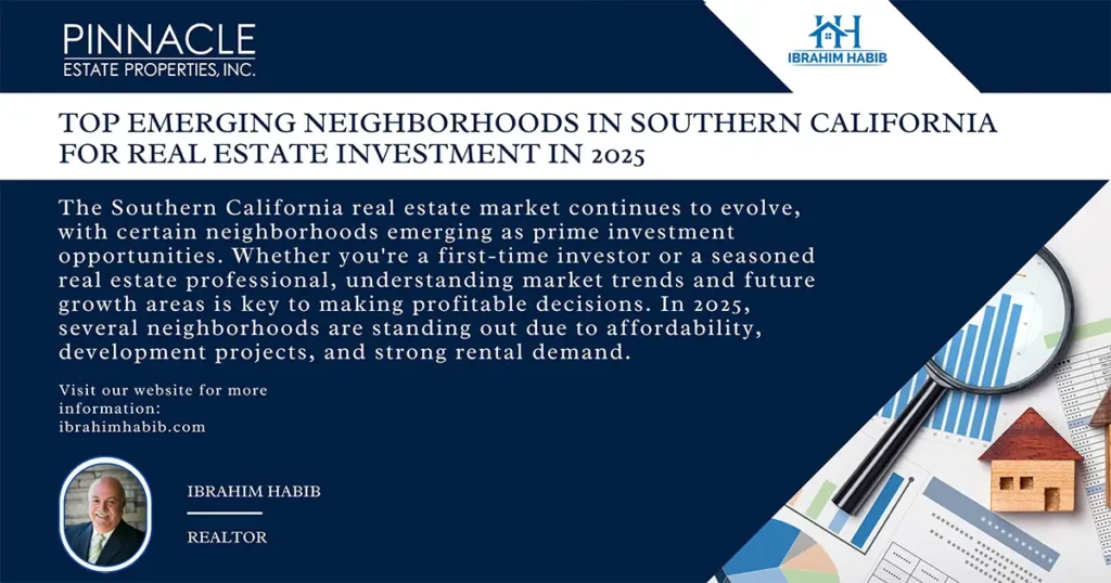 Introduction The Southern California real estate market continues to evolve, with certain neighborhoods emerging as prime investment opportunities. Whether you’re a first-time investor or a seasoned real estate professional, understanding market trends and future growth areas is key to making profitable decisions. In 2025, several neighborhoods are standing out due to affordability, development projects, and strong rental demand. 1. Riverside and San Bernardino – Affordable Alternatives to Los Angeles 2. Long Beach – Coastal Investment Potential 3. Palmdale and Lancaster – The Next Tech Hubs 4. Chula Vista – San Diego’s Hidden Gem 5. Costa Mesa – The Perfect Mix of Suburb and City Conclusion Southern California remains a hot market for real estate investors, but success depends on choosing the right location. Emerging neighborhoods with strong economic growth, infrastructure investments, and rental demand present some of the best opportunities in 2025.