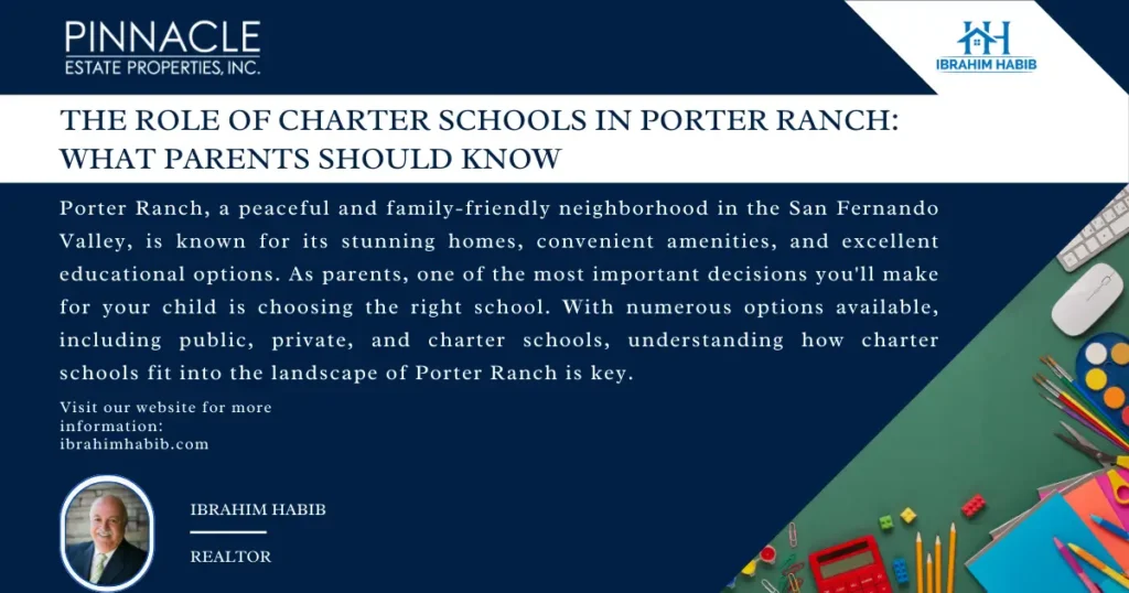 Porter Ranch, a peaceful and family-friendly neighbourhood in the San Fernando Valley, is known for its stunning homes, convenient amenities, and excellent educational options. As parents, one of the most important decisions you’ll make for your child is choosing the right school. With numerous options available, including public, private, and charter schools, understanding how charter schools fit into the landscape of Porter Ranch is key. In this post, we’ll explore the role of charter schools in Porter Ranch, why they are an attractive option for many families, and what parents should know before making a decision. What Are Charter Schools? Charter schools are public schools that operate independently from the traditional public school district. They are publicly funded but have more freedom to implement unique curriculums, teaching methods, and educational practices. Charter schools are held to high standards, and their performance is monitored to ensure they meet academic goals. Charter schools are often established to provide more specialized education or to address gaps in the traditional school system. These schools are open to all students, and they don’t charge tuition. The Appeal of Charter Schools in Porter Ranch Porter Ranch has several well-regarded charter schools that offer unique educational experiences. Here’s why many families in Porter Ranch consider charter schools a great option: 1. Smaller Class Sizes One of the key benefits of charter schools is their smaller class sizes, which often allow for more personalized attention for students. With a lower student-to-teacher ratio, students in charter schools may find it easier to ask questions, engage with their teachers, and receive the support they need. 2. Innovative Curriculum Charter schools often have the freedom to experiment with innovative teaching methods and specialized curriculums that may not be offered at traditional public schools. For instance, some charter schools in Porter Ranch offer STEM-focused programs (science, technology, engineering, and mathematics) or arts-based curriculums, catering to different learning styles and interests. 3. Community Involvement Charter schools typically have a strong sense of community, with greater involvement from parents, teachers, and administrators. Since these schools are often more flexible, they may provide a closer-knit environment where parents and educators work together to ensure that each child is thriving. 4. Focus on Academic Excellence While all public schools are held to state academic standards, many charter schools in Porter Ranch go above and beyond to create rigorous academic programs. This focus on excellence, combined with the freedom to tailor education to the needs of the students, can provide children with the tools they need to succeed academically. Charter Schools in Porter Ranch: A Few Notable Options Porter Ranch is home to some outstanding charter schools, which have earned reputations for their commitment to quality education. Here are a few worth noting: 1. Castlebay Lane Charter School Castlebay Lane Charter School is one of the most recognized charter schools in the area. It offers a well-rounded curriculum, including enrichment programs in art, music, and physical education. With a GreatSchools rating of 10/10, Castlebay Lane is known for its academic excellence and community-oriented environment. 2. Porter Ranch Community School This charter school provides a challenging curriculum along with strong support systems for its students. Porter Ranch Community School is a popular choice for parents who seek an academically rigorous environment where students are encouraged to explore their passions and develop critical thinking skills. 3. Valor Academy High School Located near Porter Ranch, Valor Academy High School is another charter school that offers a high-quality education. With a focus on college readiness and leadership development, Valor Academy prepares students for success in higher education and beyond. What Parents Should Know Before Enrolling in a Charter School While charter schools offer many benefits, there are a few things parents should consider before enrolling their child: 1. Lottery System Charter schools are publicly funded but often have limited space. As a result, many charter schools use a lottery system to select students. It’s important to understand that getting into a charter school isn’t always guaranteed, so parents may need to have a backup plan if their child isn’t selected. 2. School-Specific Application Process Charter schools often have their own application processes, which may differ from traditional public schools. Be sure to research the application deadlines, requirements, and any necessary documentation well in advance. 3. Commitment to the School’s Philosophy Charter schools typically follow a specific educational philosophy or curriculum, so it’s important to ensure that the school’s approach aligns with your values and your child’s learning style. Whether it’s a focus on the arts, STEM, or character development, make sure you understand the school’s educational priorities. Conclusion: Is a Charter School Right for Your Family? Porter Ranch offers a wealth of educational opportunities, and charter schools are an important part of that landscape. With smaller class sizes, innovative curriculums, and a focus on academic excellence, charter schools in Porter Ranch provide an environment where students can thrive and reach their full potential. For parents in Porter Ranch, charter schools offer an appealing alternative to traditional public schooling. However, as with any important decision, it’s crucial to do your research and consider whether the educational philosophy, environment, and application process align with your child’s needs. If you’re considering a charter school for your child, take the time to visit the schools, talk to current students and parents, and c