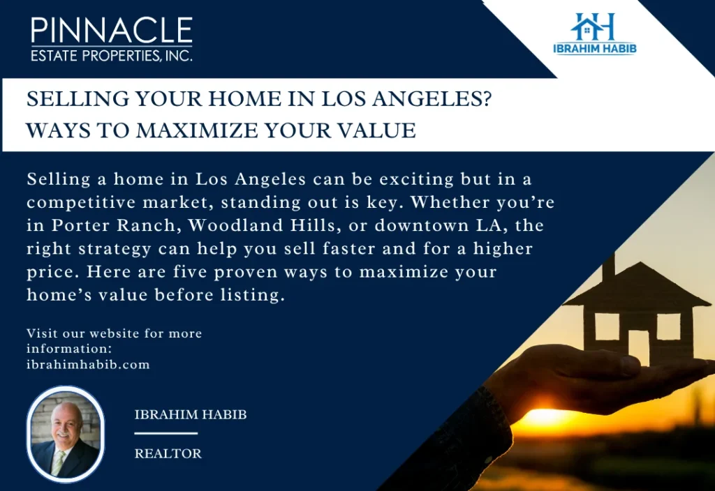 Introduction: Selling a home in Los Angeles can be exciting but in a competitive market, standing out is key. Whether you’re in Porter Ranch, Woodland Hills, or downtown LA, the right strategy can help you sell faster and for a higher price. Here are five proven ways to maximize your home’s value before listing. 1. Enhance Curb Appeal Your home’s first impression starts at the curb. Fresh landscaping, a new coat of paint, and well-kept walkways can instantly add appeal. In LA, where outdoor living is everything, make your exterior shine. 2. Stage Your Home Professionally A well-staged home helps buyers visualize themselves living there. Declutter, rearrange furniture for flow, and add neutral décor. Professional staging in Los Angeles can increase perceived value by thousands of dollars. 3. Upgrade Key Features Simple updates go a long way think modern lighting, fresh paint, or updated kitchen fixtures. Focus on the kitchen and bathrooms, as they offer the best ROI for LA buyers. 4. Invest in High-Quality Photos and Video Tours Over 90% of LA homebuyers start their search online. Professional real estate photography and virtual tours make your listing stand out and attract serious buyers fast. 5. Partner with an Experienced Realtor The Los Angeles market is dynamic pricing, timing, and negotiation matter. Working with an experienced Realtor ensures your property is marketed strategically to get the best offers. Conclusion: Selling your home in LA isn’t just about listing it, it’s about positioning it for success. With the right improvements and expert guidance, you can maximize your return and move forward confidently.