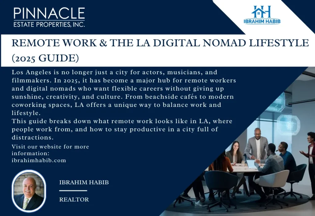Introduction Los Angeles is no longer just a city for actors, musicians, and filmmakers. In 2025, it has become a major hub for remote workers and digital nomads who want flexible careers without giving up sunshine, creativity, and culture. From beachside cafés to modern coworking spaces, LA offers a unique way to balance work and lifestyle. This guide breaks down what remote work looks like in LA, where people work from, and how to stay productive in a city full of distractions. What Is a Digital Nomad in Los Angeles? A digital nomad is someone who works online and isn’t tied to a single office. In LA, this often includes: Unlike traditional nomads who move city to city, many LA digital nomads are “semi-nomadic”, working remotely while staying in one neighborhood for months at a time. Best Neighborhoods for Remote Workers in LA 1. Santa Monica 2. Silver Lake & Echo Park 3. Downtown LA (DTLA) 4. Venice Top Coworking Spaces in Los Angeles Coworking spaces help remote workers stay focused and meet others. Popular features include fast Wi-Fi, meeting rooms, and networking events. Common benefits: Many LA coworking spaces also offer day passes, which is great for flexible schedules. Working from Cafés: The LA Way LA has a strong café culture, and many remote workers rotate between spots to stay inspired. Tips for café productivity: Challenges of Remote Work in LA Remote work in LA isn’t perfect. Common challenges include: Successful remote workers often set strict schedules and boundaries to stay productive. How to Stay Productive in a High-Energy City Conclusion Los Angeles offers one of the most exciting remote work lifestyles in the country. With the right balance of structure and flexibility, digital nomads can enjoy both career growth and a high quality of life.