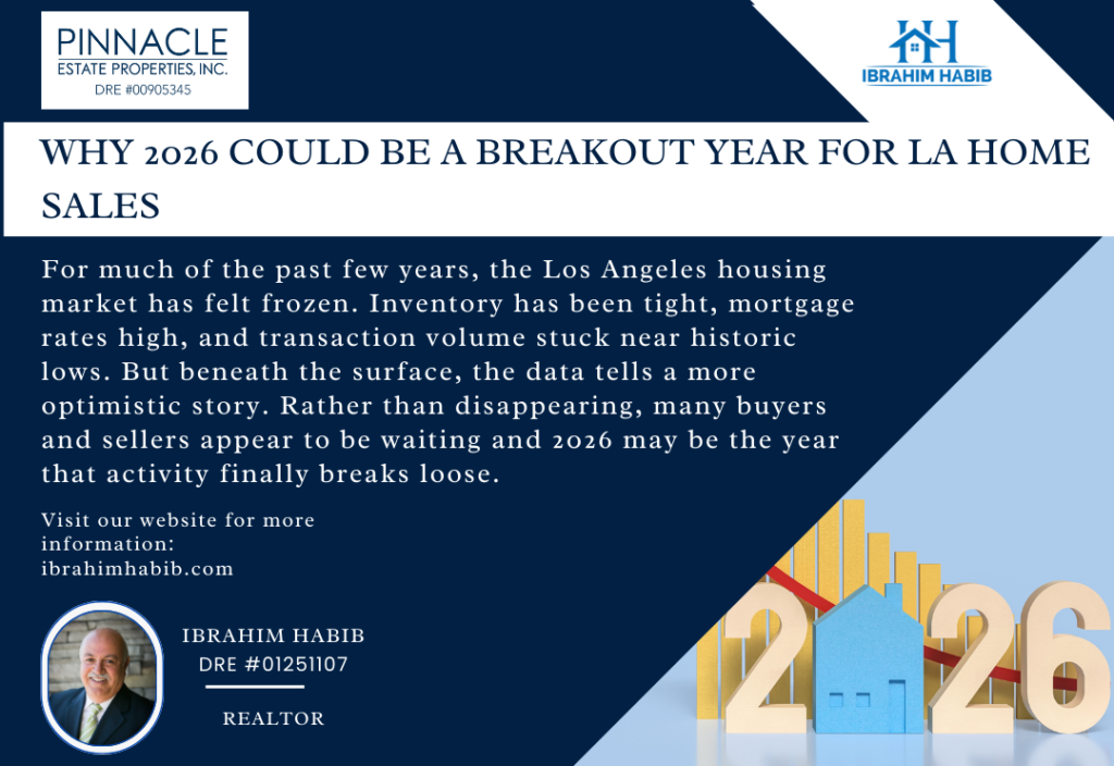 For much of the past few years, the Los Angeles housing market has felt frozen. Inventory has been tight, mortgage rates high, and transaction volume stuck near historic lows. But beneath the surface, the data tells a more optimistic story. Rather than disappearing, many buyers and sellers appear to be waiting and 2026 may be the year that activity finally breaks loose. The Market Isn’t Dead It’s Delayed One of the clearest signals of hidden demand comes from listing withdrawals. In 2025, nearly half of newly listed homes in LA were pulled off the market without selling. At first glance, this looks concerning. Some have called it “shadow inventory,” assuming these homes will flood the market later and pressure prices. But a closer look reveals something different. Most withdrawals are not investors exiting the market. They are owner-occupants families who need to sell their current home in order to buy their next one. When these sellers pause, they don’t just delay one transaction; they delay two: a sale and a purchase. That means many 2025 transactions weren’t canceled they were postponed into 2026. Mortgage Applications Tell the Same Story Mortgage data reinforces this idea. Throughout 2025, purchase mortgage applications ran 15–25% higher year over year, while actual closed sales rose only slightly. Applying for a mortgage is not casual behavior. These are serious buyers who gathered documents, ran numbers, and planned to move but didn’t complete the transaction. Why? Rates may have ticked up at the wrong time The right home never appeared Monthly payments stayed just out of reach What matters is that these buyers didn’t disappear. They paused. What Could Unlock the Market Mortgage rates are a key factor, but they aren’t the only one. Historically, buyer activity picks up when rates approach 6%. Even brief dips toward that level have sparked noticeable increases in showings and offers. Equally important is job mobility. Hiring has slowed as workers “job hug,” choosing security over change. When people don’t change jobs, they usually don’t change homes. If hiring improves in 2026 even alongside slightly higher unemployment as more people re-enter the workforce confidence could return quickly. That combination of moderating rates + improved job confidence is what could finally unlock the logjam. A Stronger Upside Than Forecasts Suggest Most economists are calling for about 5% growth in home sales in 2026. But the data on delayed demand suggests something stronger is possible. If conditions cooperate, 8–10% sales growth is not unrealistic potentially the strongest post-pandemic rebound in transactions. The LA housing market isn’t frozen because demand vanished. It’s frozen because demand is waiting. And waiting demand can move quickly once conditions change.